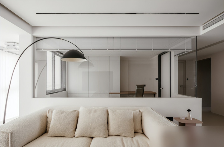 阳光透进来的时候,帘布飘起来像给空间加了层滤镜,想偷懒的时候把毛毛虫沙发和茶几移到阳台,直接变成“放空角”——谁不想周末窝这儿晒着太阳刷剧啊?还有书房的半墙玻璃隔断,既能和客厅互动(比如煮咖啡时喊一声“要不要喝?”),拉上百叶帘又能安静工作,比那种全封闭书房有人情味多了——毕竟生活不是“关起门来”,是“想靠近的时候能靠近,想独处的时候能独处”。