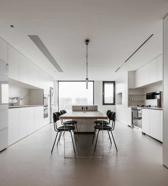 餐厅的“神来之笔”是北阳台的全景落地窗!本来北阳台光线暗,换成落地玻璃后,吃饭的时候能看外面的树影,比那种装推拉门的餐厅通透一百倍。中岛加餐桌的组合也实用:炒完菜直接端到中岛,煮咖啡做烘焙也不用跑厨房,比开放式厨房更“有边界感”——不会让油烟飘得满屋子都是,又能保持空间连贯通透。有人肯定问“白色显脏怎么办?”屋主说“找保洁”——现在年轻人装修不就是这样?先满足自己的喜欢,麻烦的事以后再说,总比装成长辈喜欢的“红木沙发+水晶灯”强!