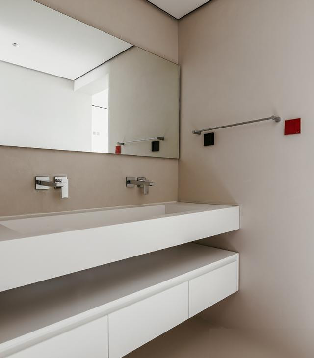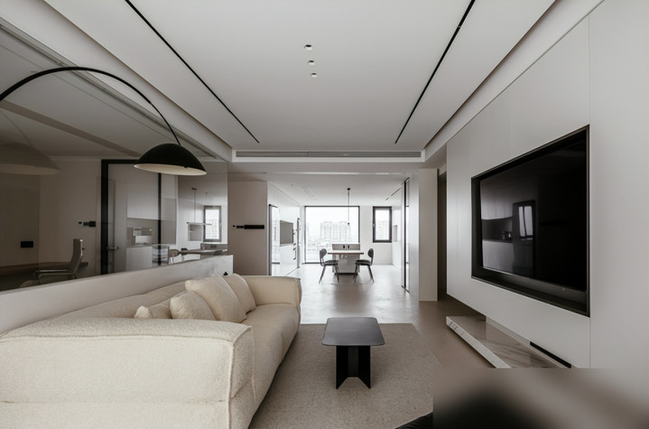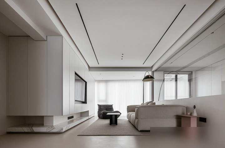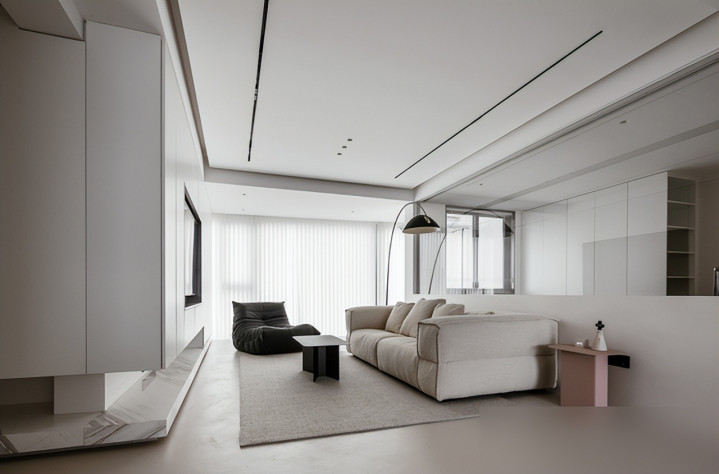 再看客厅,真的“干净到骨子里”:地面用微水泥,比瓷砖暖,比地板耐造,关键墙角没踢脚线——墙和地像“粘”在一起,没有多余的线条;顶面没主灯,就用筒灯和射灯打光,连阴影都柔柔和和的。电视背景墙是转角储物柜,无拉手门一关上,连个缝都没有,比那种摆一堆装饰画的背景墙高级十倍——不是没储物,是所有东西都“藏”得刚好,比如遥控器、零食、孩子的玩具,全塞进柜子里,表面连个印子都没有。