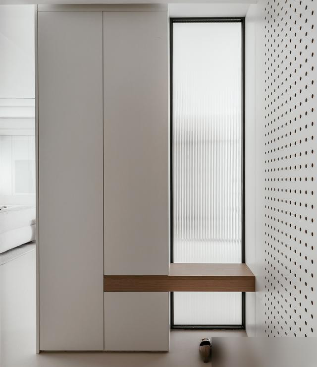 人家没砸墙没动结构,就做了个带长虹玻璃和洞洞板的隔断柜——底下是换鞋凳,中间放鞋,上面长虹玻璃透点光不压抑,洞洞板挂钥匙、雨伞刚好。